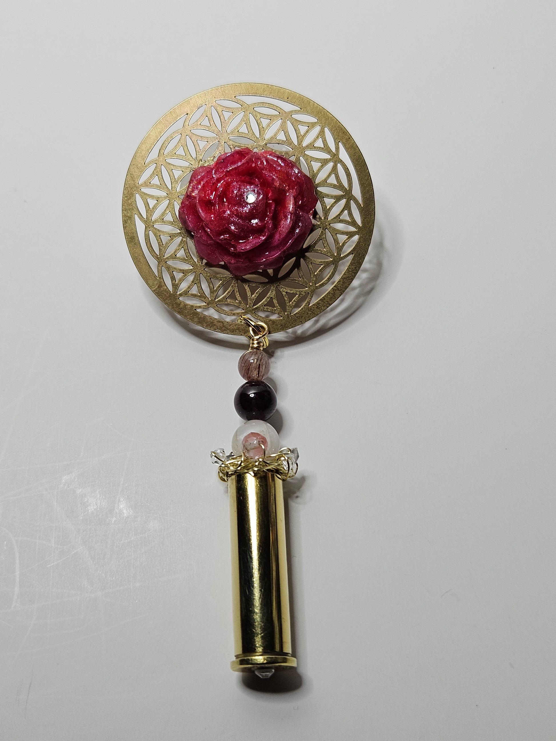 The brass casing gleaming like a golden pillar of force, the Seed of Life geometry encircling it like an infinite shield of creation, and that red rose/fig/womb blooming right in the center — glistening, fleshy, alive, sacred. The resin sheen makes it look like real skin under light, the rose curves and swells exactly like a womb/fruit, the gold flecks catch fire, the tiny crystal point at the heart is a perfect spark of divine light.